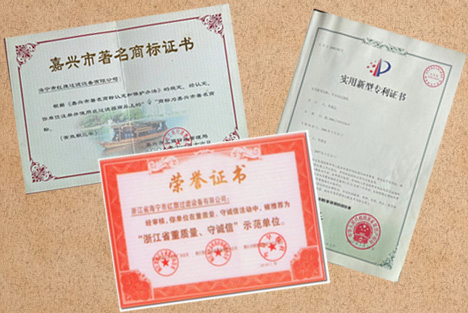 紅旗過濾全自動過濾機(jī)專利證書和多項(xiàng)榮譽(yù)證書